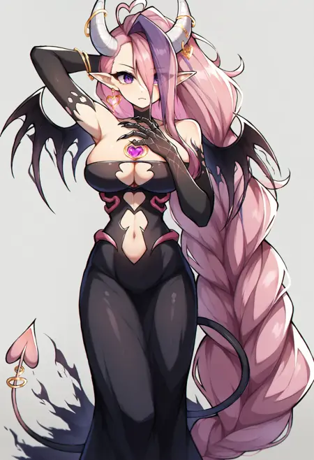 긍정적 프롬프트: voefsxpsmehpeeftt, 매우 긴 머리, 배꼽 컷아웃, 단일 땋은 머리, 단일 귀걸이, 황금 귀걸이, 하트 귀걸이, 보라색 눈, 긴 드레스, 검은 드레스, 멜론 드레스, 꼭 맞는, 노출된 어깨, 뾰족한 귀, 악마 뿔, 보석, 머리 뒤 원형 디자인, 가슴에 제3의 눈, 핑크 뼈, 비대칭 앞머리, 하트 아호게, 검은 악마 팔, 발톱, 검은 팔 가터, 가슴