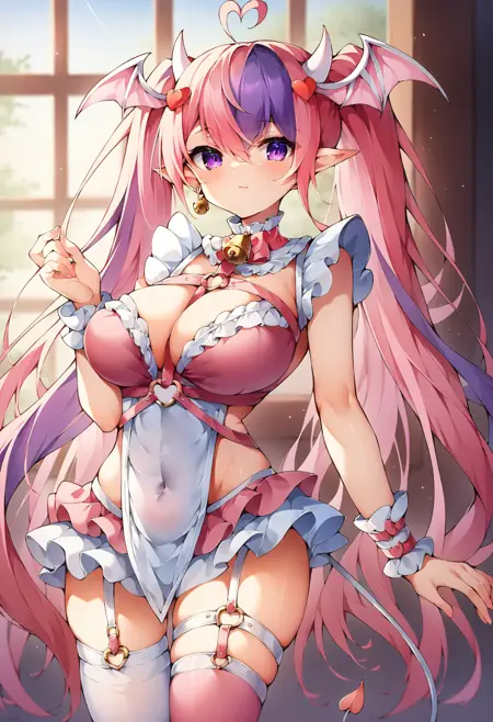 긍정적 프롬프트: efnpouxp, 보라색 눈, 뾰족한 귀, 뿔, 트윈테일, 머리 날개, 악마 꼬리, 불균형한 다리 착용, 어울리지 않는 다리 착용, 비대칭 다리 착용, 흰색 히그, 핑크 히그, 단일 귀걸이, 네플리제, 흰색 배 커튼, 흰색 드레스, 핑크 드레스, 붉은 하트 머리 장식, 하트 링 붉은 가슴 하네스, 가슴 사이, 흰색 어깨 프릴, 활, 분리된 칼라, 프릴 칼라, 흰색 칼라, 핑크 칼라, 종소리, 초커, 가터 스트랩, 엉덩이 벤트, 종소리, 흰색 손목 가터, 덮인 배꼽, 앞머리, 단일 사이드록