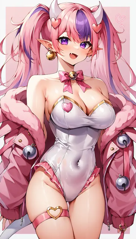 긍정적 프롬프트: sbdfrvffouxp, 뿔, 핑크 하트 머리 장식, 트윈테일, 오픈 재킷, 털 장식 재킷, 핑크 재킷, 어깨 드리핑, 종소리, 가슴, 핑크 허벅지 스트랩, 하트, 보라색 눈, 악마 꼬리, 멜론레오타드, 흰색 레오타드, 프릴 레오타드, 황금 장식, 핑크 상패 리본, 하트, 뾰족한 귀, 핑크 양말매듭, 하트, 앞머리, 덮인 배꼽, 노출된 어깨, 캐릭터 이름, 단일 귀걸이, 단일 사이드록