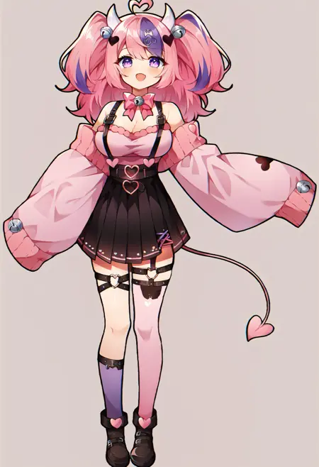 긍정적 프롬프트: gjstu, 뿔, 불균형한 다리 착용, 비대칭 다리 착용, 어울리지 않는 다리 착용, 보라색 양말, 핑크 히그, 플리츠 스커트, 하이웨스트 스커트, 검은 스커트, 보라색 눈, 악마 꼬리, 종소리, 양쪽 위로, 검은 벨트, 더블 벨트, 하트, 플리츠 스커트, 핑크 양말매듭, 종소리, 체인, 앞머리, 크로스 레이스 부츠, 검은 부츠, 핑크 활, O-링 허벅지 스트랩, 손목을 넘어가는 소매, 검은 하트 머리 장식, 어깨 드리핑, 분리된 소매, 긴 소매, 볼륨 있는 소매, 핑크 소매, 핑크 셔츠, 검은 서스펜더, 가터 스트랩