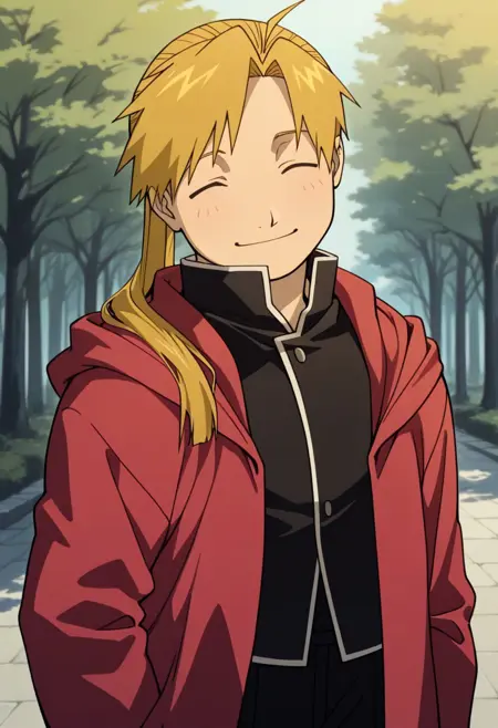alphonseelric, 1boy, male focus, solo, yellow eyes, blonde hair, long hair, ponytail, ahoge, shirt, black shirt, coat, red coat, long sleeves, open coat, open clothes, hooded coat, gloves, white gloves, pants, black pants, shoes, brown footwear,