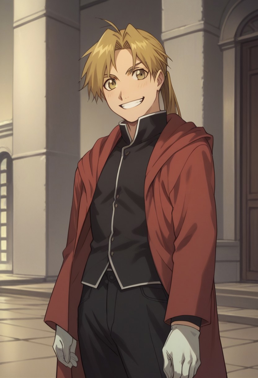 alphonseelric, 1boy, male focus, solo, yellow eyes, blonde hair, long hair, ponytail, ahoge, shirt, black shirt, coat, red coat, long sleeves, open coat, open clothes, hooded coat, gloves, white gloves, pants, black pants, shoes, brown footwear,