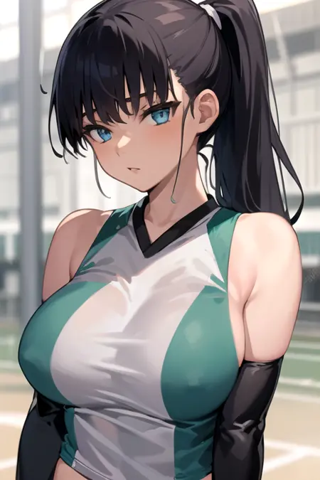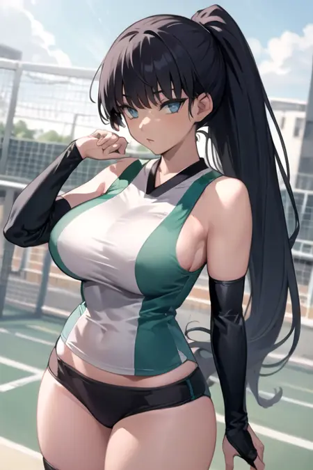 AkiraTodou, 1girl, solo, long hair, blue eyes, large breasts, shirt, black hair, bare shoulders, ponytail, sleeveless, black buruma, elbow pads, volleyball uniform, green shirt