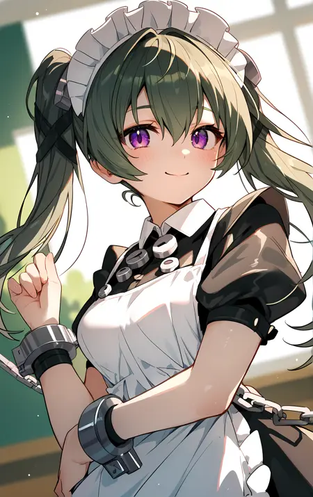 corin, 1girl, green_hair, maid_headdress, apron, twintails, solo, purple_eyes, maid, long_hair, short_sleeves, black_dress, dress, maid_apron, puffy_sleeves, white_apron, hair_between_eyes, puffy_short_sleeves, chain, cuffs, wrist_cuffs,