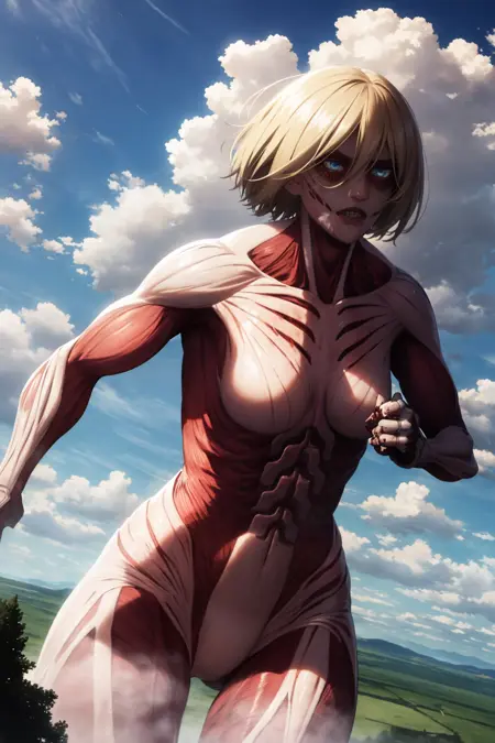 Other prompt : blonde hair, short hair, blue eyes, giantess, muscular, nude, breasts, scar, hair between eyes, abs, teeth, scar, fighting pose, flexing biceps