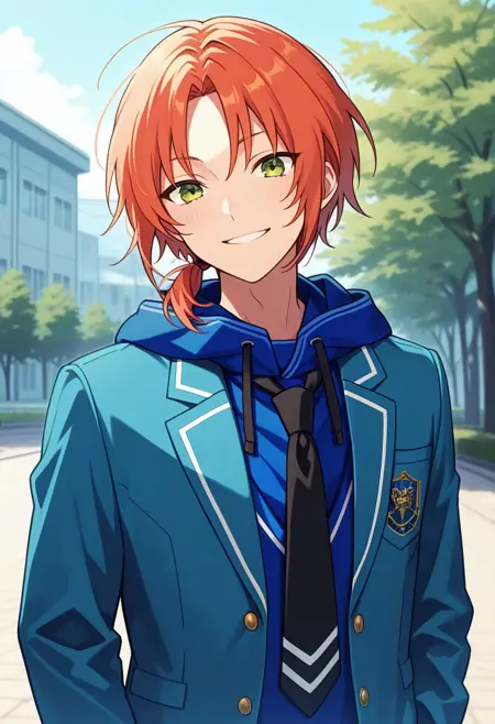 leotsukinaga, 1boy, male focus, solo, green eyes, orange hair, low ponytail, parted bangs, school uniform, hoodie, blue hoodie, jacket, blazer, blue jacket, necktie, black necktie, pants, plaid pants, plaid, boots, black footwear,