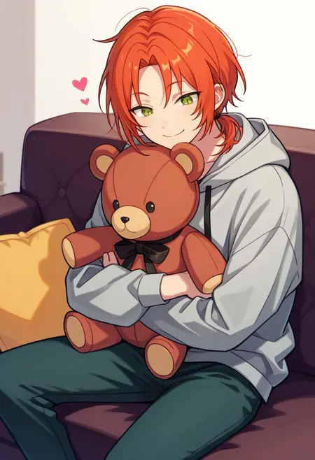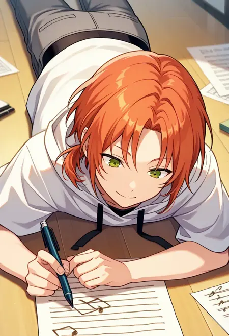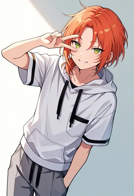 leotsukinaga, 1boy, male focus, solo, green eyes, orange hair, low ponytail, parted bangs, hoodie, white hoodie, short sleeves, drawstring, pants, grey pants,