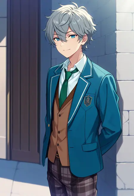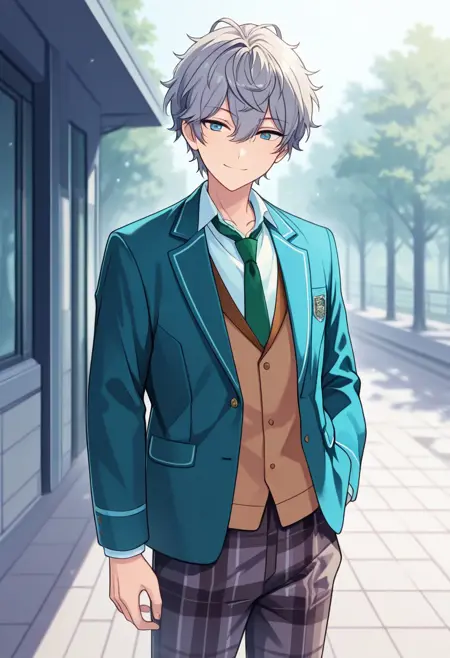 izumisena, 1boy, 플랫 팬츠, 남성 중심, 솔로, 넥타이, 학교uniform, 재킷, 파란색 재킷, 블레이저, 베스트, 갈색 베스트, 플랫, 팬츠, 녹색 넥타이, 파란 눈, 회색 머리,