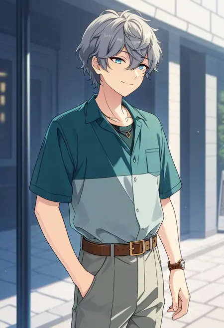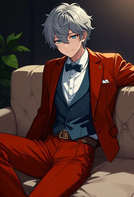 izumisena, 1boy, 남성 중심, 솔로, 파란 눈, 회색 머리, 단발, 앞머리, 눈 사이 머리, 정식, 셔츠, 드레스 셔츠, 흰색 셔츠, 리본 넥타이, 베스트, 파란 베스트, 재킷, 빨간 재킷, 긴 소매, 벨트, 빨간 팬츠
