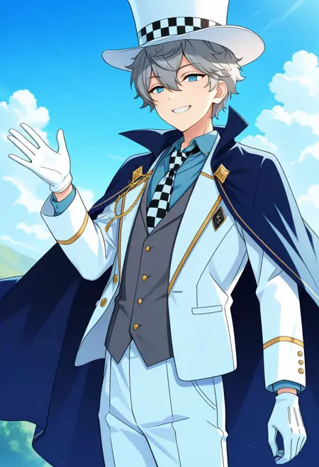 izumisena, 1boy, 남성 중심, 솔로, 파란 눈, 회색 머리, 단발, 앞머리, 눈 사이 머리, 헤드셋, 모자, 고모자, 흰색 머리장식, 셔츠, 파란 셔츠, 칼라 셔츠, 넥타이, 체크 무늬 넥타이, 체크 무늬 옷, 베스트, 회색 베스트, 재킷, 흰색 재킷, 열린 재킷, 열린 옷, 긴 소매, 망토, 파란 망토, 장갑, 흰색 장갑, 팬츠, 흰색 팬츠,