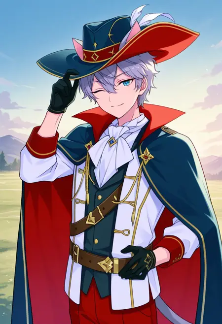 izumisena, 1boy, 남성 중심, 솔로, 파란 눈, 회색 머리, 단발, 앞머리, 눈 사이 머리, 동물 귀, 고양이 소년, 고양이 귀, 모자, 파란 머리장식, 애스콧, 흰색 애스콧, 재킷, 흰색 재킷, 긴 소매, 망토, 파랑과 빨강 망토, 양면 원단, 양면 망토, 장갑, 검은 장갑, 벨트, 팬츠, 빨간 팬츠, 고양이 꼬리,
