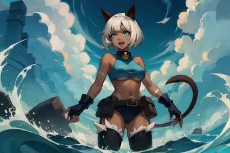 实用提示: 无指手套,短发,波波头,猫耳,小包,猫尾,爪子,蓝色露脐上衣,露乳沟,腰包,颈圈,颈铃,齐刘海,露肩。