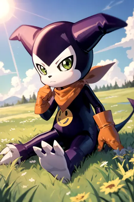 기타 프롬프트: digimon \(생물\), 녹색 눈, 인간 없음, 꼬리, 장갑, 반지, 넥타이, 발톱, 서 있는 자세
