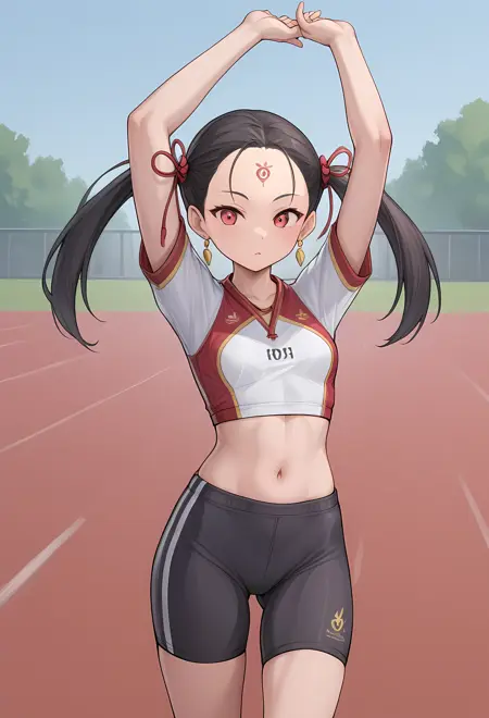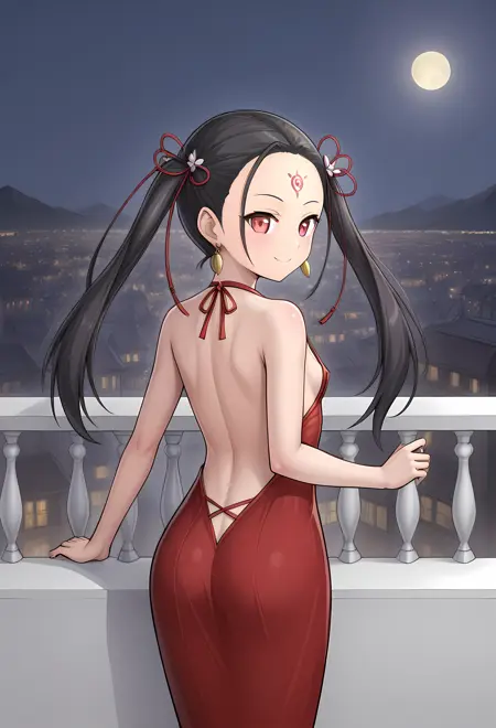 常规装扮:黑发、红眼、耳环、额头印记、发饰、双马尾、长发、和服、珠宝、长袖、宽袖、法杖、凉鞋,