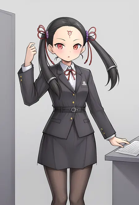 普通装扮:黑发,红眼,耳环,额纹,发饰,双马尾,长发,和服,首饰,长袖,宽袖,法杖,凉鞋,