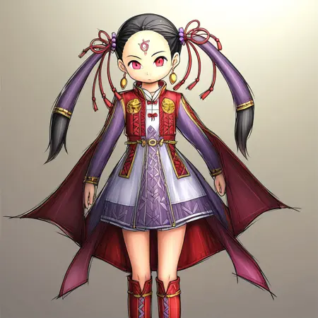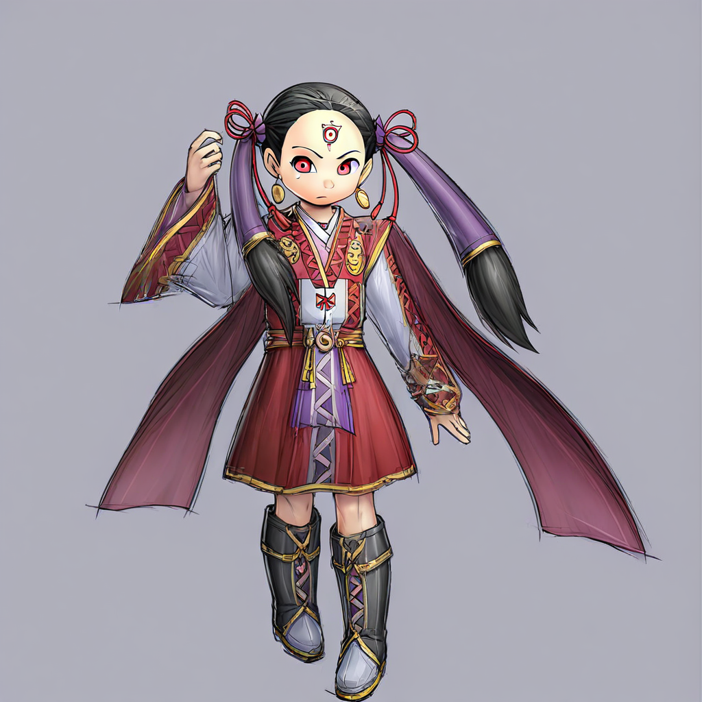 通常の衣装:黒髪、赤い目、イヤリング、額のマーク、髪飾り、ツインテール、長い髪、和服、ジュエリー、長袖、広袖、杖、サンダル