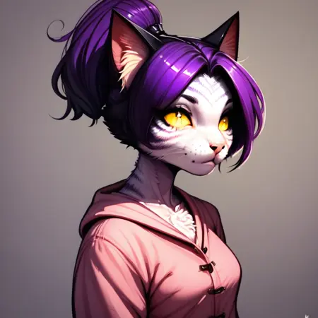 1girl, solo, 퓨리 여성, 퓨리, 고양이 소녀, 꼬리, 보라색 머리, 노란 눈, 고양이 귀, 고양이 꼬리