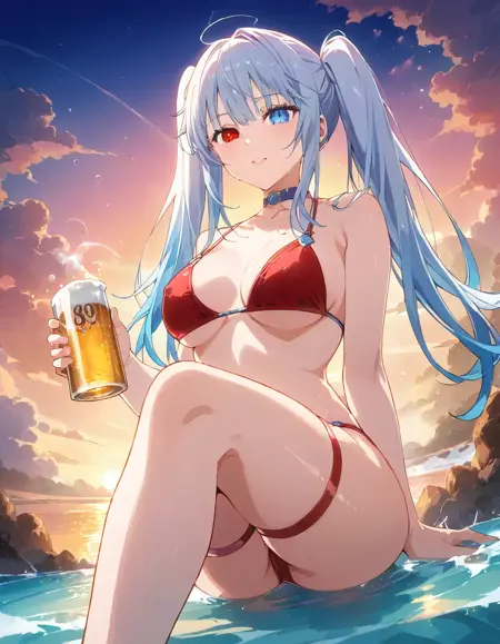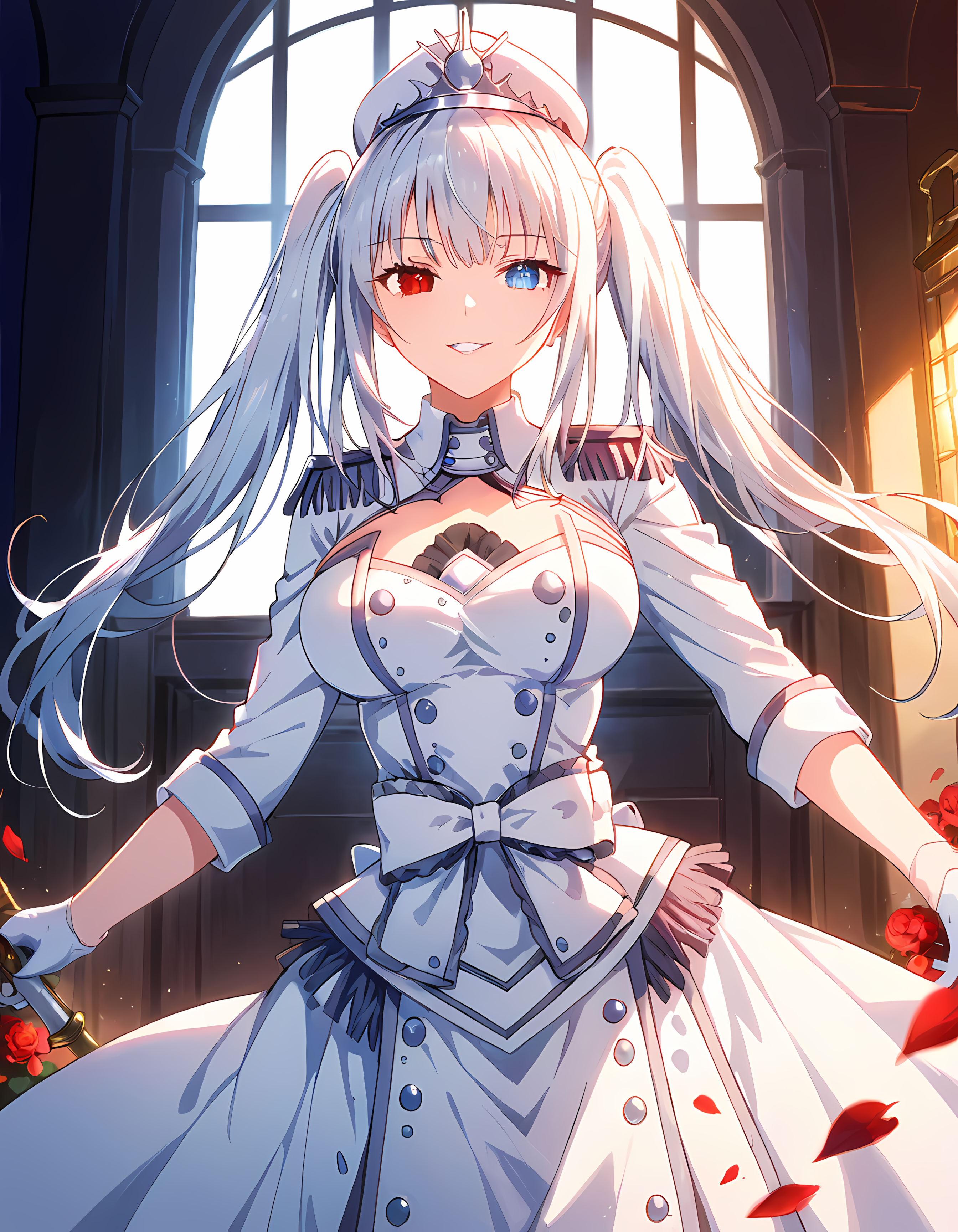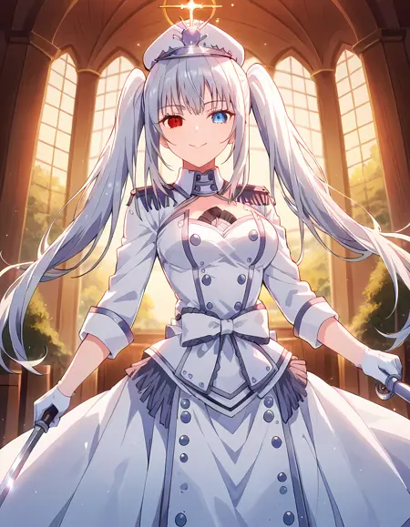 | 训练词汇 | 1girl, solo, long hair, red eyes, gloves, long sleeves, hat, dress, holding, cleavage, twintails, medium breasts, very long hair, jacket, weapon, white hair, grey hair, sword, white gloves, holding weapon, white dress, uniform, military, dutch angle, military uniform, buttons, floating hair, heterochromia, white headwear, holding sword, white jacket, white skirt, epaulettes, military hat,已复制! |