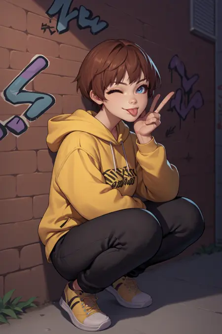 トリガー言語は「sbLily」であり、「茶色の髪、短髪、青い目」が必須です。