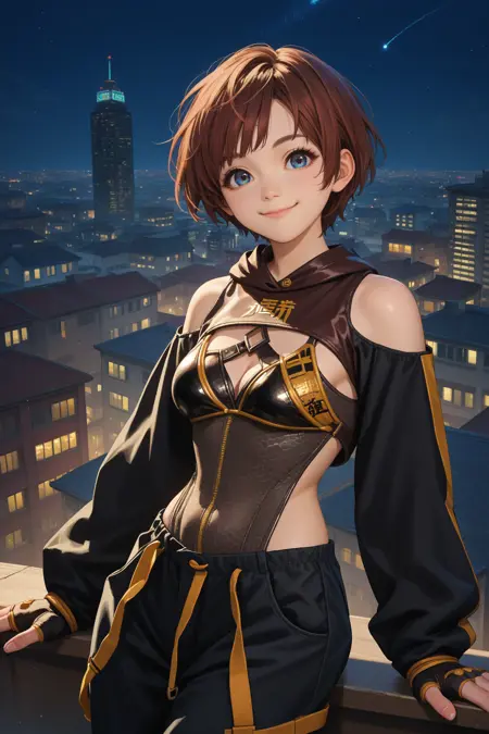 彼女の典型的な外見には、「レオタード、服の切り抜き、胸元、黒い袖、フードを下ろした状態、裸の肩、長袖、黒いズボン、指なし手袋」を追加してください。