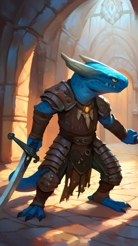 - solo,pathfinder kobold,k0bold,yellow eyes,(blue skin),standing,full body,leather armor,sword,holding sword,dungeon hallway