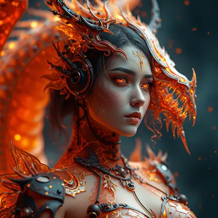 「サイバー・ドラゴンをテーマにした炎をまとうゴシック・アーケニック・テクノロジーの女性の、極めて詳細な3Dレンダリング。ケーブル、アーケニックテク・ドラゴンをインスパイアしたデザイン、機械部品の露出。外装はキラキラした透明なオレンジ、レッド、ブラックの色調で、内部構造が見えるようになっている。洗練されたファンタジー設計。抽象的なテーマの背景。極限の被写界深度。背後にドラゴンがいる。」