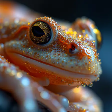 「極近接ショット、カエルの顔、星状結晶構造、複雑な模様、輝く色調。極限の被写界深度、天体の光、きらめく細部、異界の魅力、荘厳な優雅さ。」
