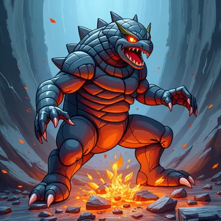 "经典宝可梦 3DCG 插画。粗轮廓线。宝可梦渲染风格。极具动感的构图展现特殊能力。上部为面部极近景,动态姿势。强烈透视,运动特效,震撼视觉效果,引人注目。一只拥有地震能力的岩石系宝可梦以动态姿态站立,身体由崎岖地形与熔岩流扭曲组成。画面上部聚焦其面部,石质面具般充满怒意,双眼燃烧。它踏地时大地碎裂,地震波如破碎画布般在抽象背景中扩散。强烈透视压缩空间,传递不可阻挡的力量。鲜艳色彩跃动:炽烈橙色、电光蓝色与余烬灰色。运动特效模糊边缘,模糊岩石与能量的界限。前景爆发震撼视觉特效,呼应宝可梦原始力量。杰作,专业,最高品质,锐利,极致细节,超精细,高分辨率,复杂,生动。"