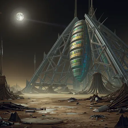 "科幻景观,废弃外星结构,全息虹彩,巨大金属拱门,暗夜天空,破损天线。地面遍布残骸,散落的废墟,远处月球,昏暗光线。"