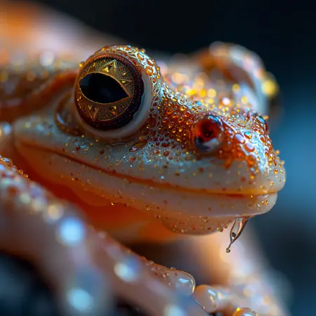 "极近景,青蛙面部,星状晶体结构,复杂图案,发光色彩。超大景深,天体光线,闪烁细节,异界魅力,宏伟优雅。"