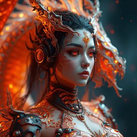 "极度精细的 3D 渲染肖像:一位以赛博龙为主题的火焰哥特式神秘科技女性,带有电缆和神秘科技龙元素设计,裸露机械结构。外壳为闪亮透明橙红黑三色,可清晰看见内部构造。精致的奇幻设计,抽象主题背景,超大景深,龙体位于后方。"