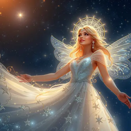 "空灵星之公主,薄纱长裙,闪烁星尘,精致光环,光芒四射的美。夜空,发光星座,柔和光线,梦幻氛围,迷人魅力。"