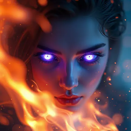 "4K 超近景的空灵女性面容,双眼散发诡异神秘光环,晶体结构呈紫蓝色调。周围烈焰翻腾,动态火焰与运动特效营造眩晕氛围。超大景深强化超现实异界感。焦点处发光双眼增添神秘诡异感,以非传统视角拍摄,突出神秘氛围。使用 Octane 和 Redshift 光线追踪实现逼真火焰与光影效果,达成超真实 3D 渲染,具有强烈梦幻质感。"