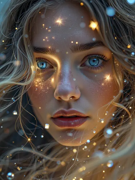 5. "空灵星之公主,薄纱长裙,闪烁星尘,精致光环,光芒四射的美。夜空,发光星座,柔和光线,梦幻氛围,迷人魅力。"
