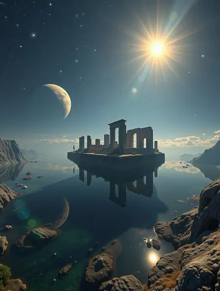 "SF 풍경, 버려진 외계 구조물, 홀로그램 빛의 무지개, 거대한 금속 아치, 어두운 하늘, 손상된 안테나. 땅은 파편과 산재한 잔해로 뒤덮여 있고, 멀리 달이 보이며 희미한 빛이 비춘다."