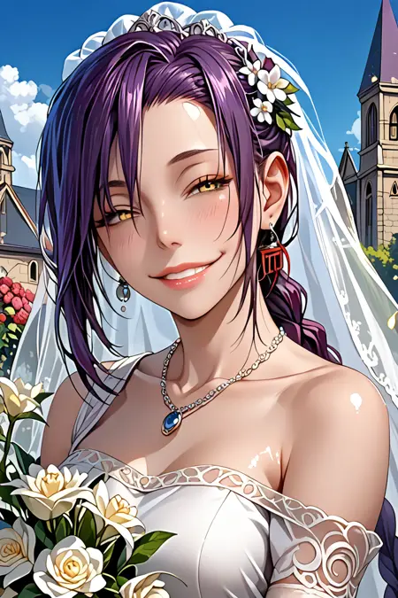 Magane_Chikujoin,紫色头发,1个女孩,辫子,黄色眼睛,发饰,超长发,长发,发铃,简单辫子,