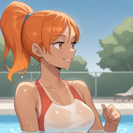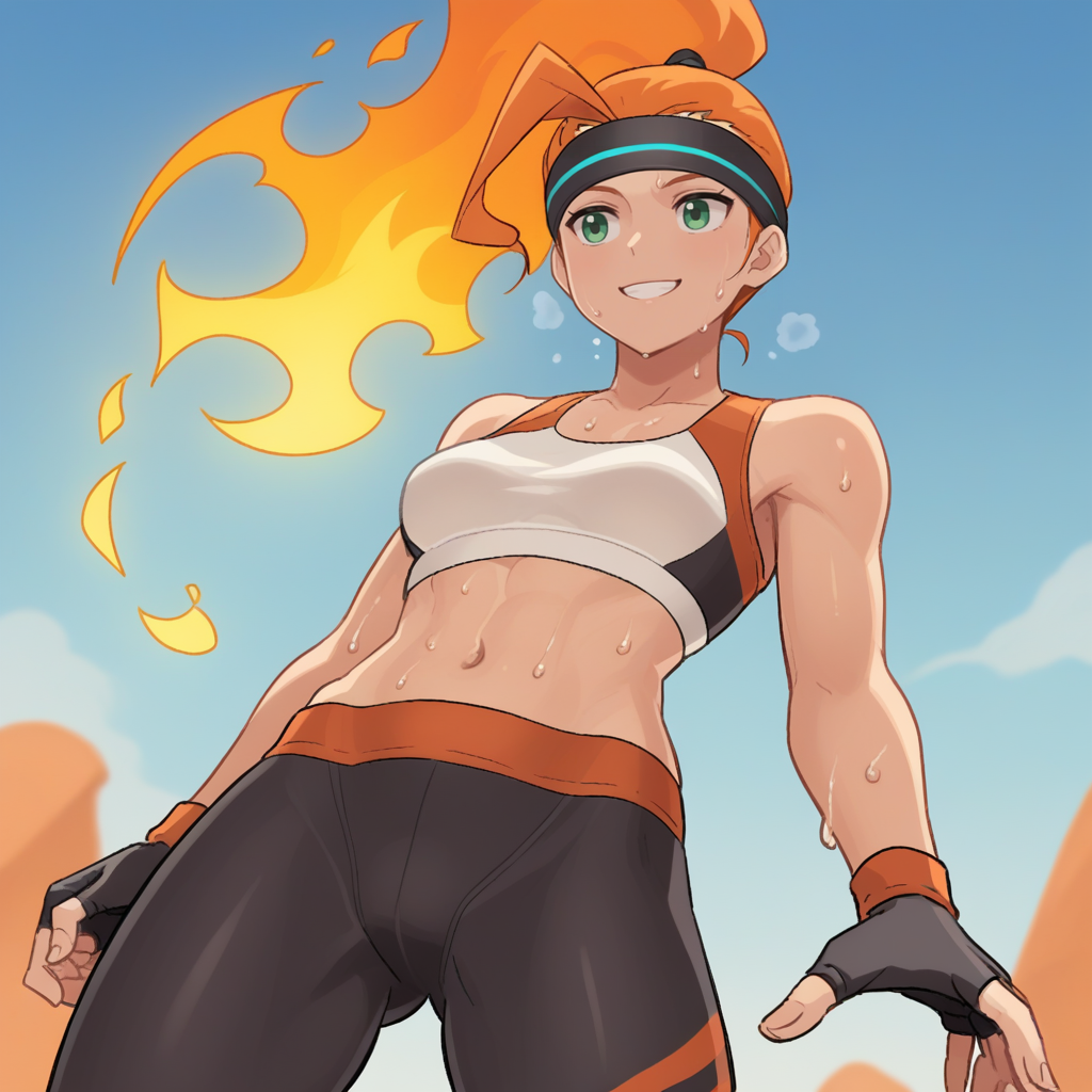 可选:绿色眼睛、火焰色头发、橙色头发、运动文胸、瑜伽裤、肚脐、头带、露脐、无指手套