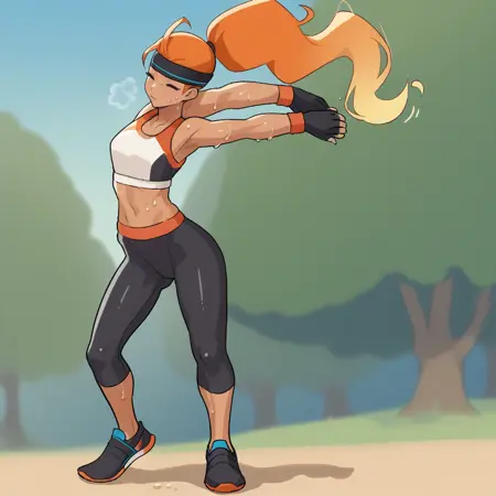 green eyes, fire hair,orange hair, sports bra, yoga leggings,navel, headband, midriff, fingerless gloves