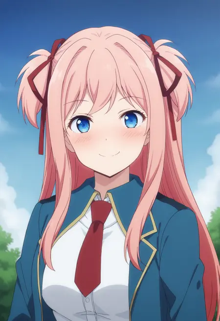 彼女の外見のタグ: 1girl, solo, long hair, blue eyes, ribbon, hair ribbon, pink hair, red ribbon, two side up,