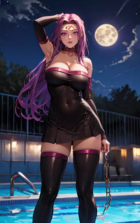 분리된 소매, 어깨가 드러난 드레스, 어깨 노출, 검은 드레스, 가슴선, 짧은 드레스, 검은 허벅지 스타킹, 체인, 검은 소매, 가린 배꼽, 젯타이 루잉키, 허벅지,