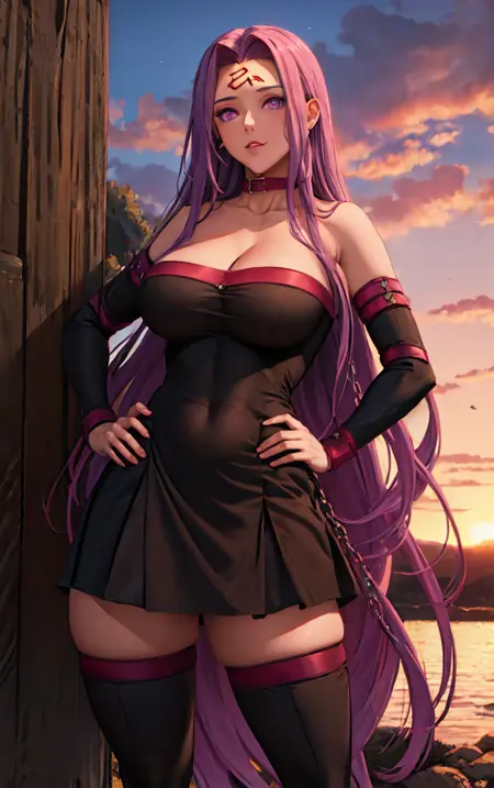 1girl, 극도로 긴 머리, 보라색 머리, 옆머리, 매우 긴 머리, 눈가리개, 얼굴 문신, 이마 문신, 목걸이, 큰 가슴, 데리골, 긴 머리, 보라색 눈,