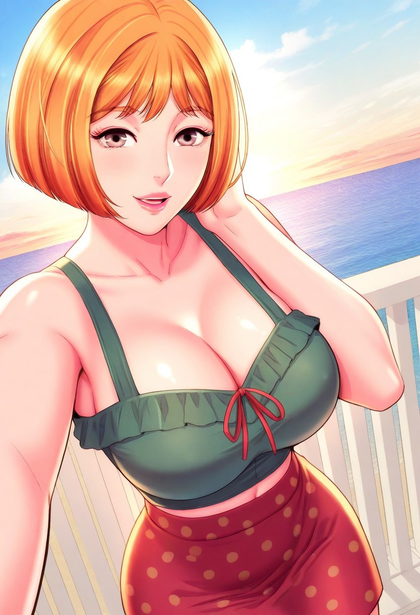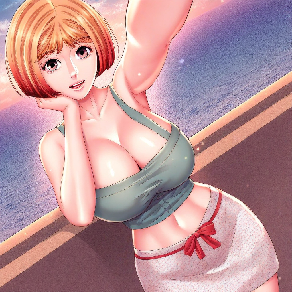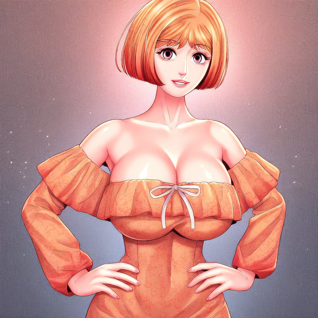 (( lora:mi-ri:1 , mi-ri, thin waist, wide hips, beautiful skin, piercing light brown eyes, clear eyes, bright pupils, beautiful eyes, beautiful orange hair, beautiful medium bob haircut, bangs, huge and shaggy breasts, natural beauty, extraordinary beautiful woman, attractive woman, super sexy woman, lustful body, sexy woman with seductive obscene body, sensual body, voluptuous body, sexy beauty, no piercings, no piercing, ))