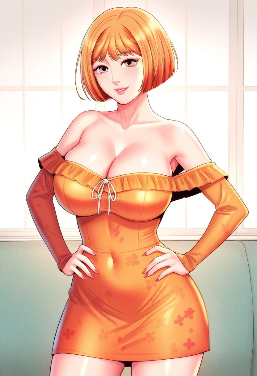 9. ((beautiful off-shoulder long-sleeves orange dress with white ribbon bow, obscene cleavage, huge cleavage, )) sexy white panties, orange high-heels,