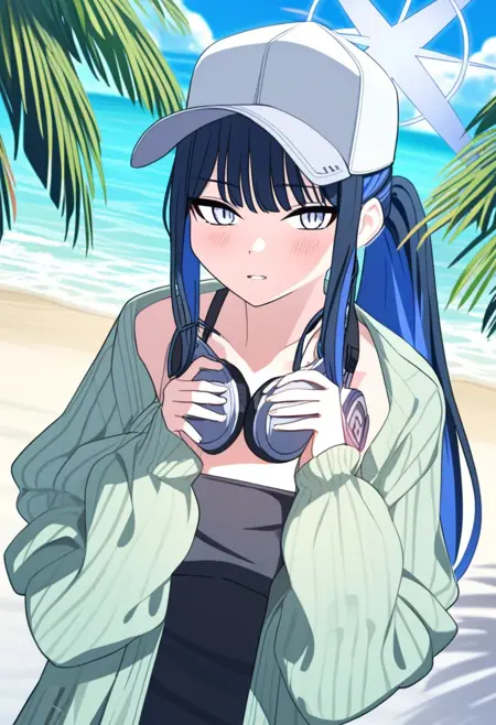 saori \(swimsuit\) \(blue archive\), black camisole, baseball cap, denim, headphones, aqua jacket
