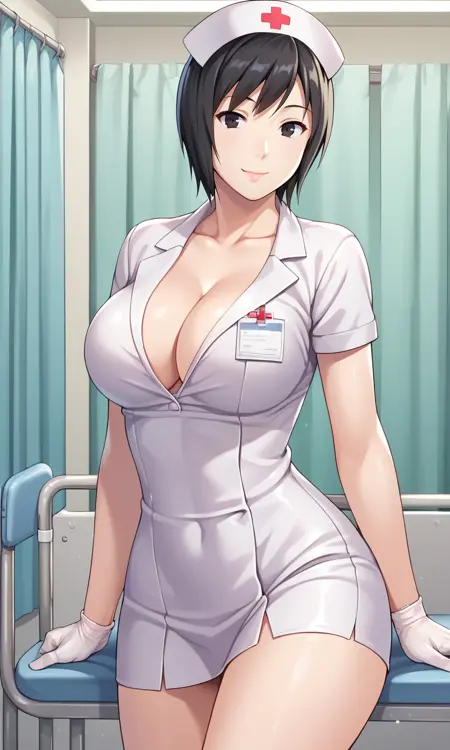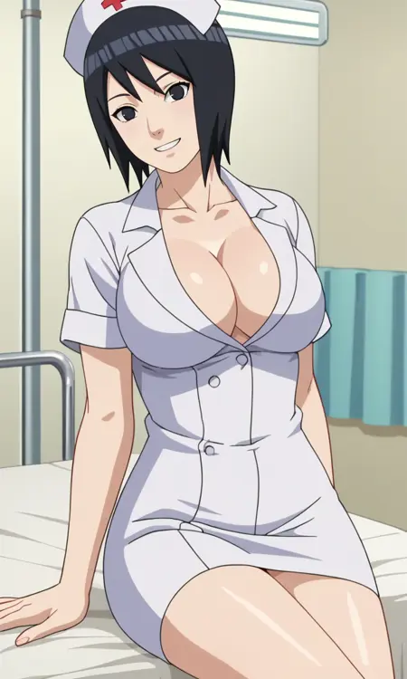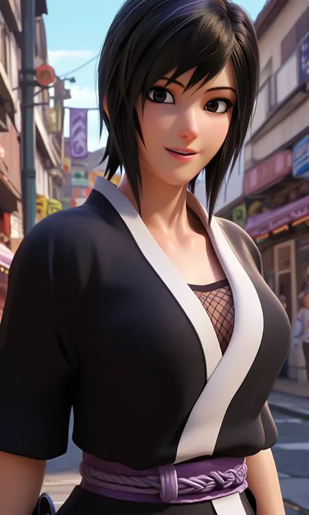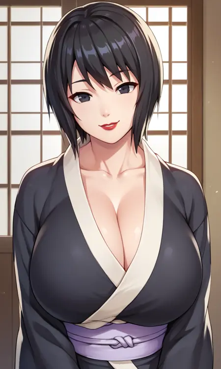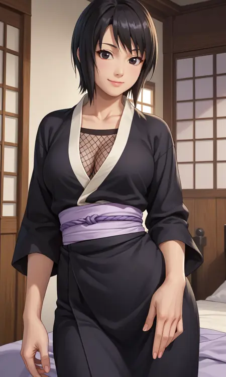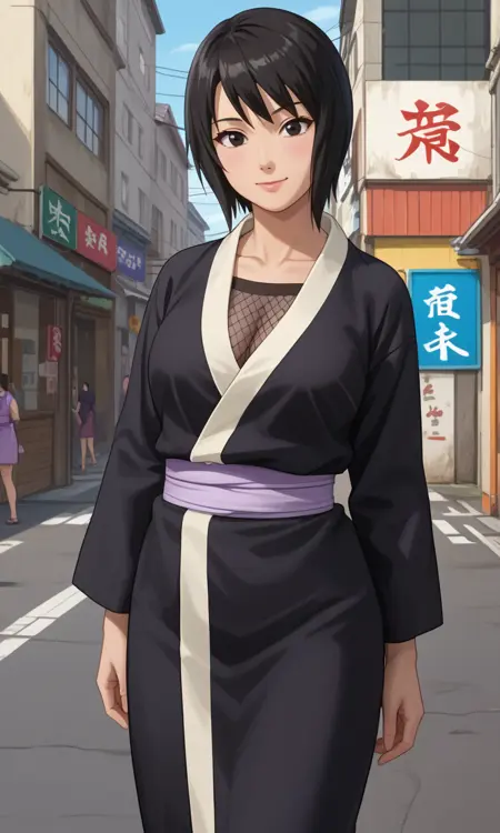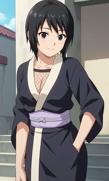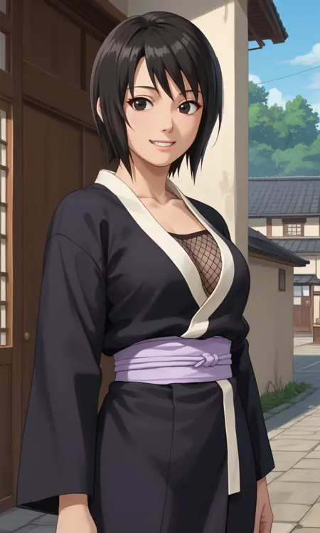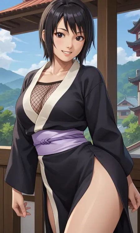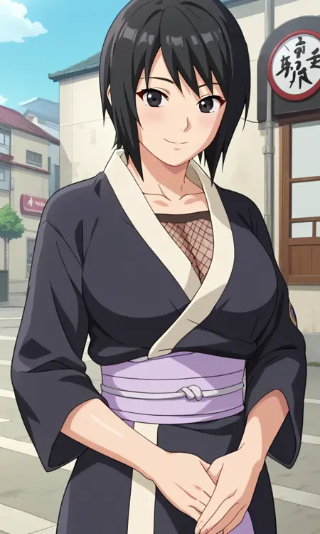 score_9, score_8_up, score_7_up, score_6_up, score_5_up, score_4_up, Shizune, short hair, black hair, black eyes, black kimono, white trim, light purple obi, smile, collarbone, mesh shirt