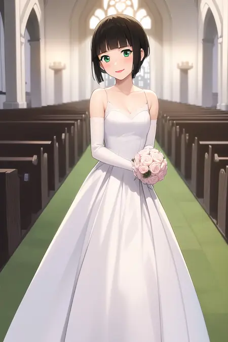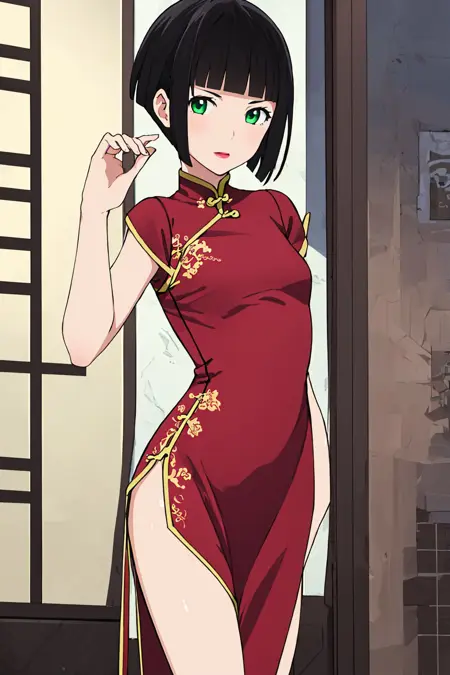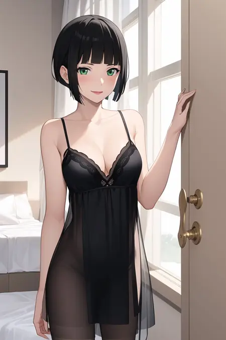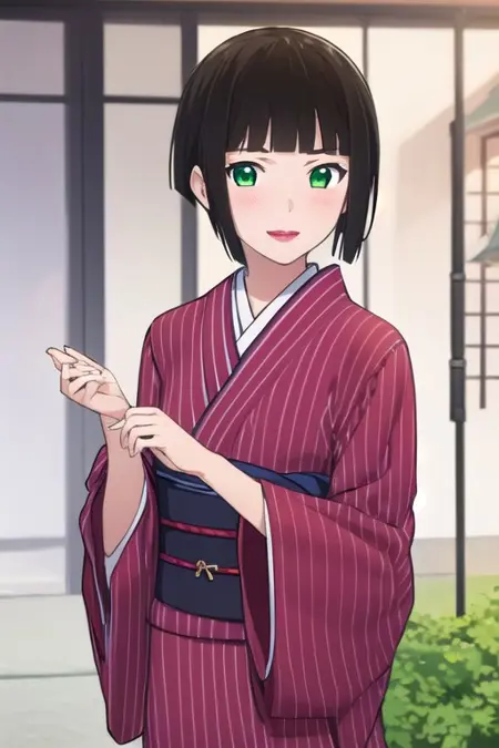 mayu, tomone, black hair, blunt bangs, short hair, sidelocks, green eyes, lipstick