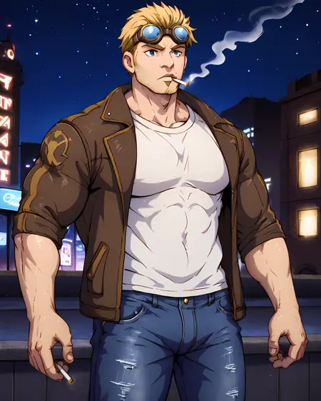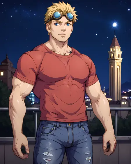 score_9, score_8_up, damon_baird, goggles, shirt, tie, long pants, beard, blonde hair, muscular