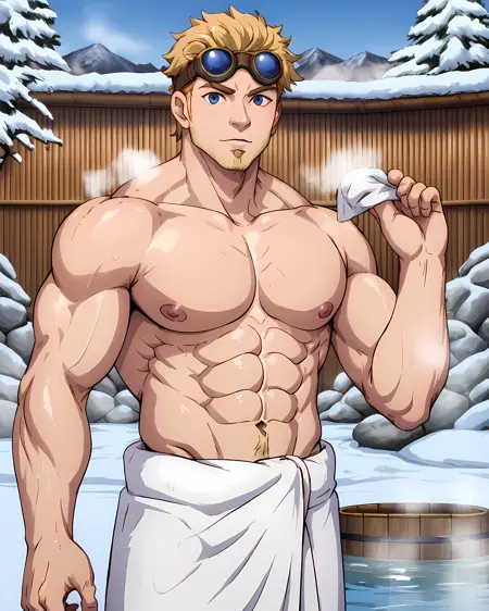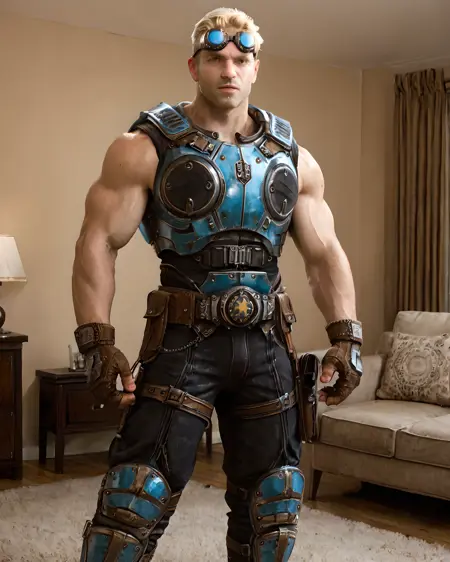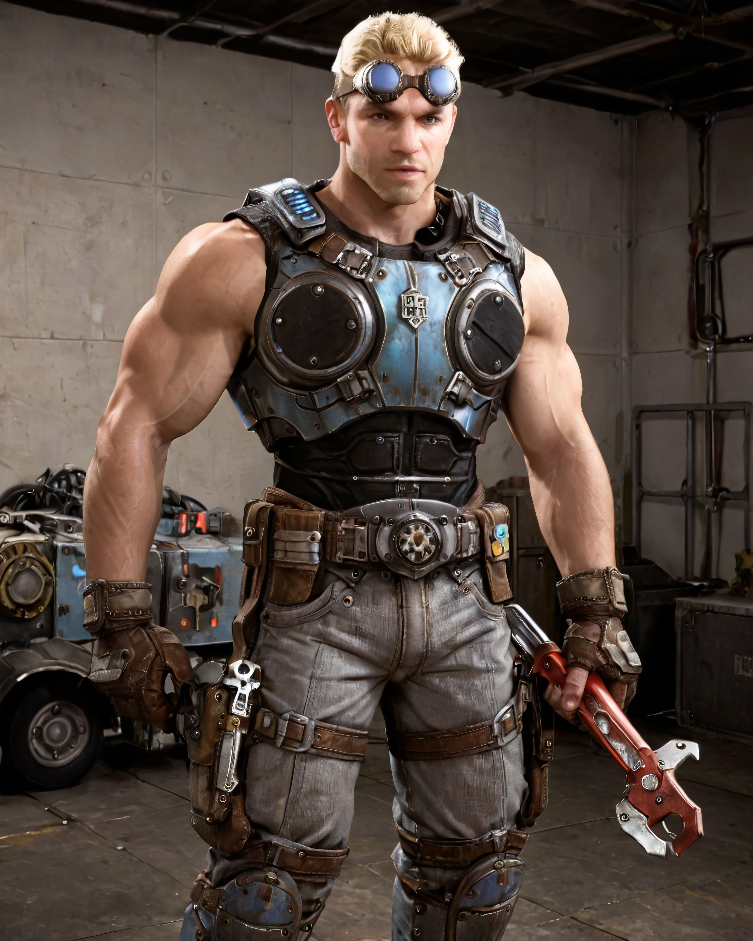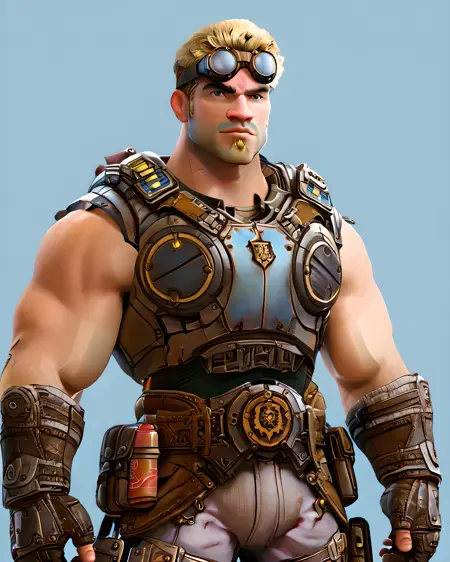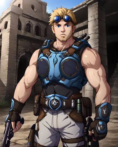 damon_baird, goggles, armor, beard, blonde hair, muscular