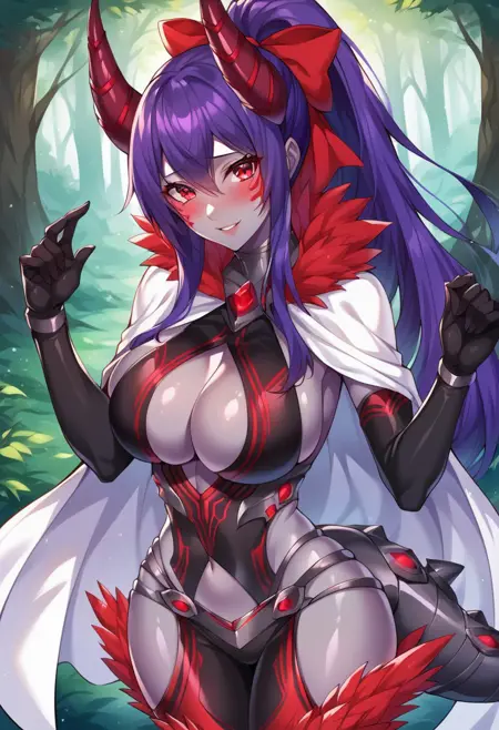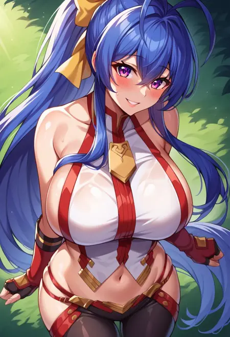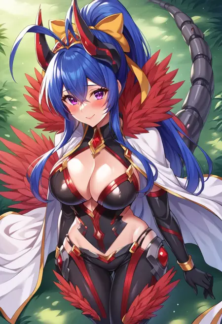 | Trained Words | purple eyes, blue hair, long hair, antenna hair, ponytail, hair between eyes, long hair, sidelocks, yellow ribbon,Copied! dark persona, colored skin, gray skin, red eyes, dark purple hair, red facial tattoo, ponytail, hair between eyes, long hair, sidelocks, red ribbon, Copied! bare shoulders, backless outfit, sideboob, fingerless red gloves, white halter top with red trimming, black lowleg pants, hip vent, navel, midriff,Copied! school uniform, zettai ryouiki, white shirt, blue coat, red tie, pleated skirt, black skirt, black thighhighs,Copied! sunglasses, heart-shaped eyewear, eyewear on head, blue striped bikini, yellow straps, rims that is decorated with yellow ribbons, red hair flower, anklet, jewelry,Copied! headdress with two dark horns, backless outfit, metallic halterneck, cleavage cutout, collar with red feathers and a white cape attached, black pants, hip vent, hip vent with red feathers around inner thigh, black gloves, mechanical tail,Copied! |