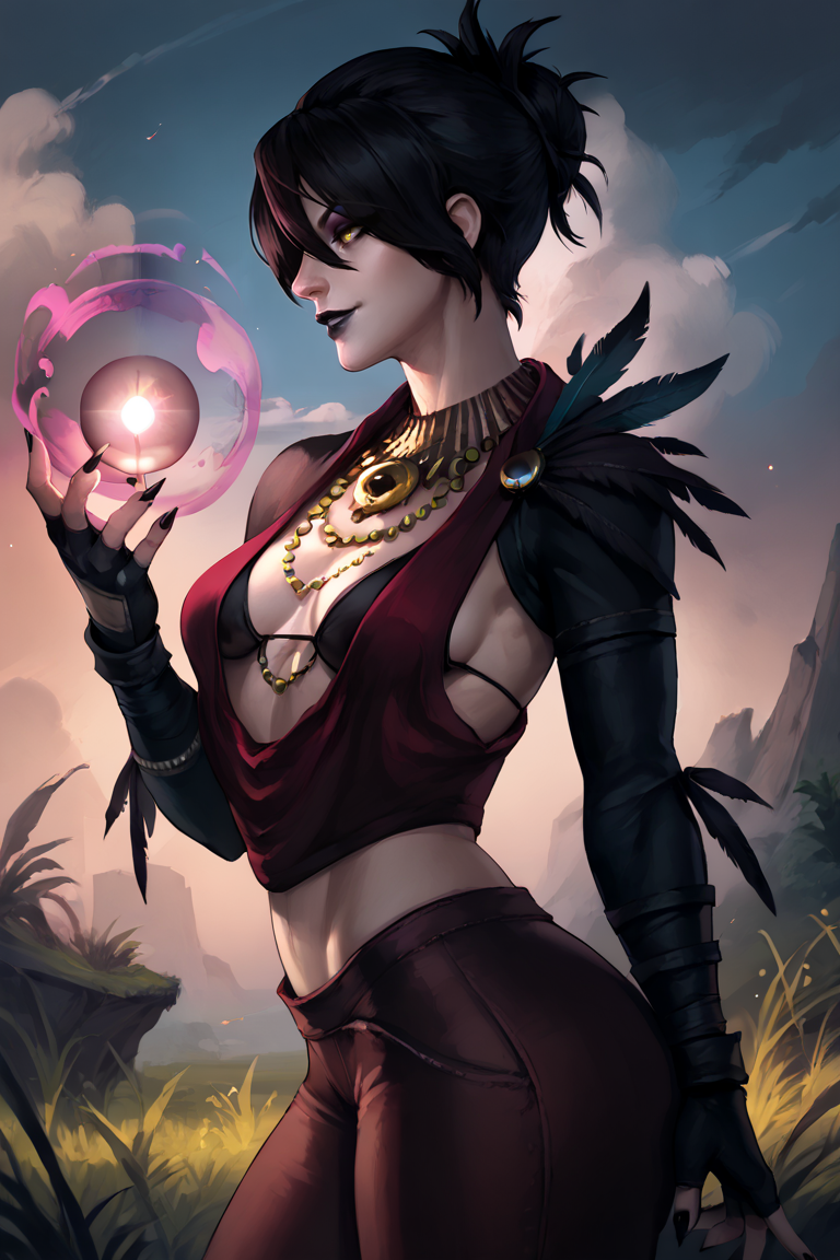 morrigan_da, 검은 머리, 노란 눈, 한쪽 눈 위의 머리카락, 단발, 머리빗, 보석, 목걸이, 메이크업, 손톱 매니큐어, 검은 손톱, 검은 입술, 손톱, 손가락 없는 장갑, 아이섀도우, 입술, 비키니 상의만, 스트링 비키니, 꼭 맞는 바지, 깃털, 불균형한 소매,